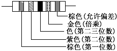 示例 1)在电阻体的一端标以彩色环,电阻的色标是由左向右排列的,图1的电阻为27000Ω±0.5%。 2)精密度电阻器的色环标志用五个色环表示。第一至第3色环表示电阻的有效数字,第4色环表示倍乘数,第5色环表示容许偏差,图2的电阻为17.5Ω±1%